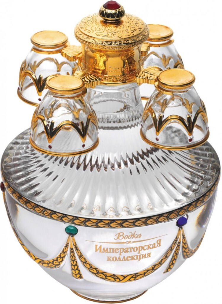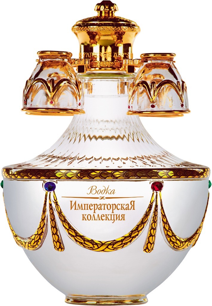 Императорская Коллекция — водка супер-премиум класса, созданная дарить истинное удовольствие. Ее разливают в графин, который изготовлен из венецианского стекла и декорирован разноцветными камнями и натуральной позолотой. Уникальный футляр, выполненный в форме яйца работы всемирно известного Карла Фаберже, с первых секунд привлекает к себе внимание. Футляр-яйцо покрыт эмалью и украшен аналогично графину. В набор также входят 4 рюмки, изготовленные вручную из венецианского стекла, и прикрепленные на кронштейн золотистого цвета.