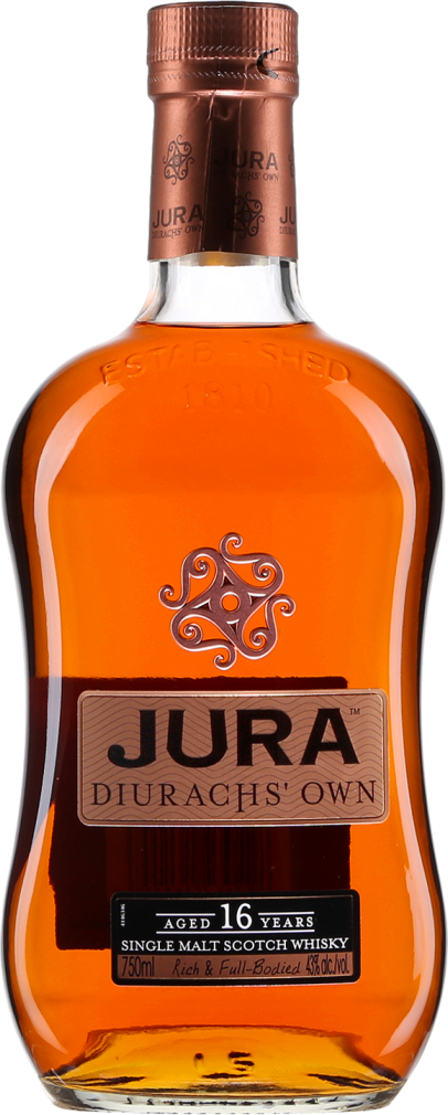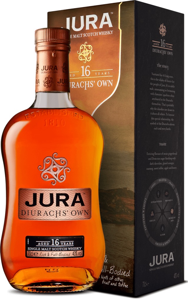 16-летний виски от "Айл оф Джура" — это напиток с невероятно крепким вкусом, который неспешно созревал 14 лет в бочках из американского белого дуба и 2 года в бочках из-под хереса Amoroso Oloroso. Длительная выдержка рождает многогранность вкусовых и ароматических оттенков, большинство из которых — яблоки, сливочный ирис, темный шоколад, апельсины, мед и пряности — напоминает о рождественских угощениях. Виски носит красноречивое название "Diurachs Own", этот виски выбирают жители Джуры — дьюраки. Подобно любому дьюраку, каждая капля этого напитка неповторима и наполнена гордостью, энтузиазмом и богатыми традициями.
