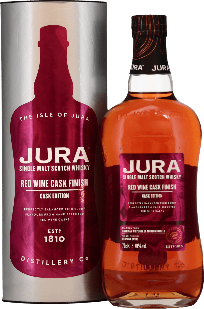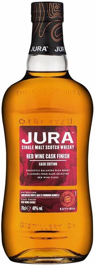 Isle of Jura, Red Wine Cask Finish — односолодовый виски, выдержанный в бочках из-под бурбона из белого американского дуба с финишной выдержкой в бочках из-под красного вина. Виски прекрасен в качестве дижестива, его можно употреблять с фруктами.
