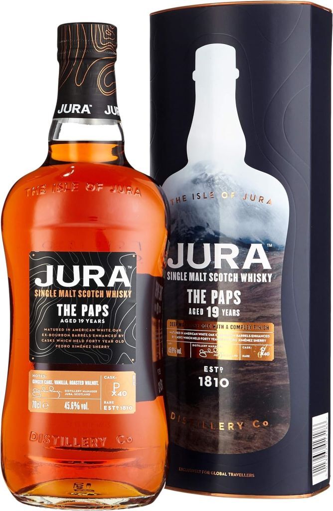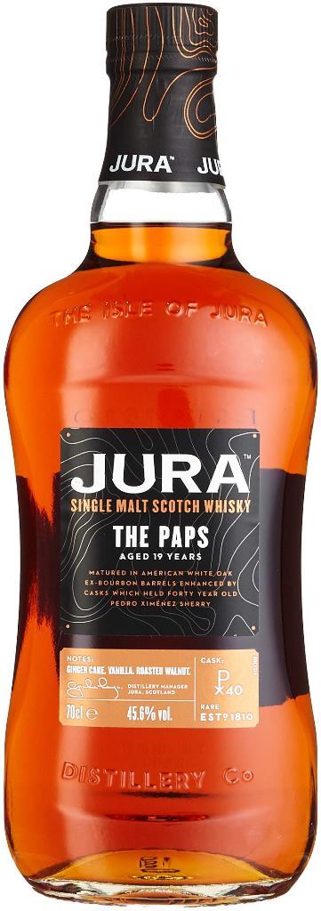 Isle of Jura, The Paps, 19 Years Old — особый виски с острова Джура, отличающийся богатым, щедрым вкусом и ароматом. Виски выдерживался 19 лет в бочках из американского белого дуба из-под бурбона, а финишная выдержка проходила в бочках из-под хереса Педро Хименес. Виски прекрасен в качестве дижестива, его можно употреблять с фруктами.