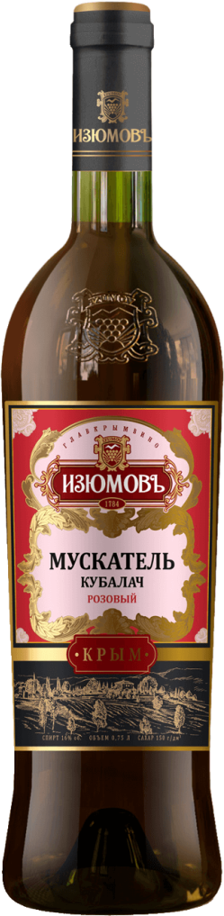 Изюмовъ, Мускатель Кубалач Розовый — десертное вино от винодельческой компании "Изюмовъ", которое создают из выращенного на побережье Крыма винограда. Для производства вина используют сорта Мускат белый, Мускат розовый, Кокур белый, Алиготе. Идеальные климатические условия благоприятствуют тому, что виноград приобретает необходимую сочность и сладость. А вино чарует мягким вкусом и соблазнительным ароматом.