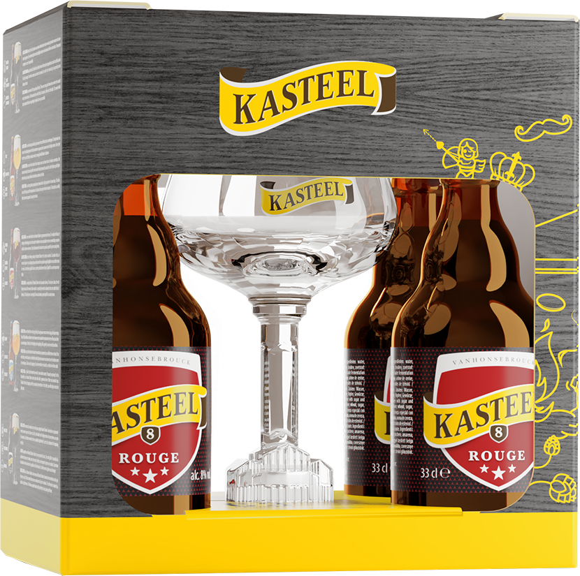 Набор Kasteel, Rouge от компании Van Honsebrouck включает в себя 4 бутылки пива объемом 0.33 л, а также фирменный бокал.