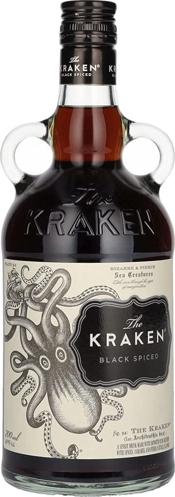 Кракен — жуткое морское чудовище с огромными щупальцами, обитающее в морских водах. Как рассказывали моряки, оно обладало такими размерами, что его можно было запросто принять за остров. Кракен топил корабли и мог убить кита. В честь этого монстра и назвали черный карибский ром "Кракен". Сырьем для изготовления рома служит патока, добываемая из сахарного тростника. Полученный ром, выдержанный 1-2 года, смешивают с миксом из 11 специй, включая гвоздику, корицу и имбирь.