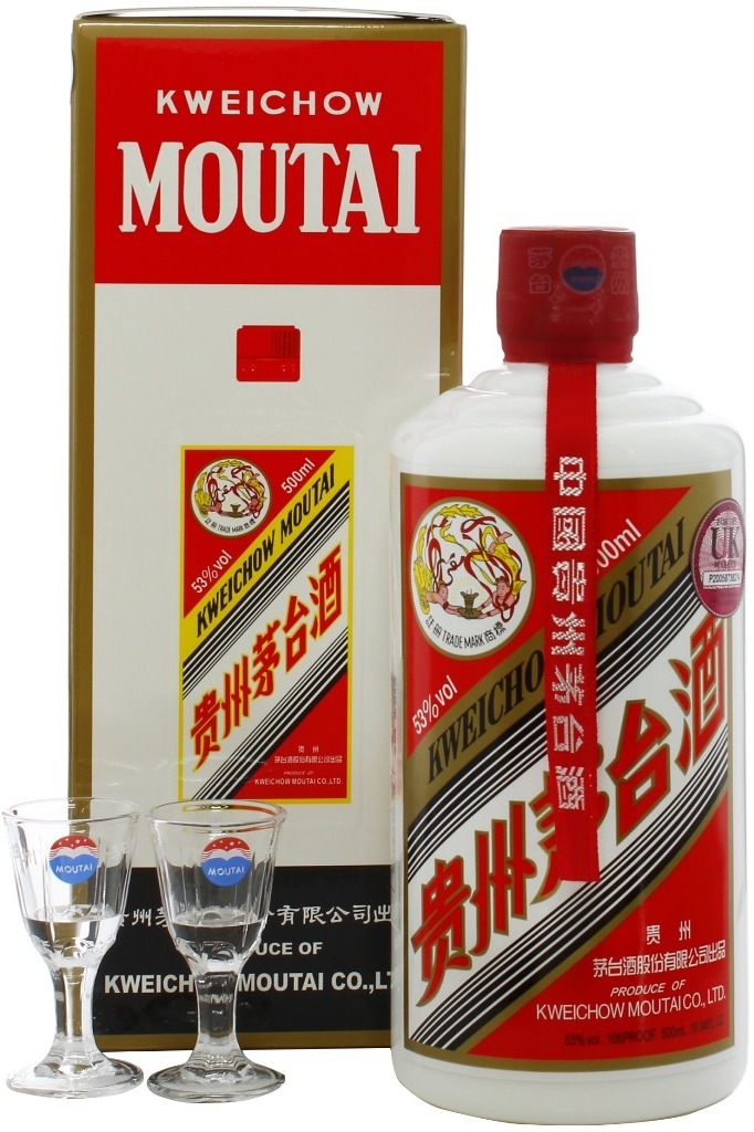 Kweichow Moutai в п/у с 2 рюмками — подарочный набор категории premium, в котором представлены традиционный китайский алкоголь с крепостью 53% и стильная стеклянная посуда для его дегустации. Презент, упакованный в красивый картонный гифт-бокс, стоит выбрать для особого повода. Спиртной напиток, созданный в городе Маотай в провинции Гуйчжоу, является национальным достоянием Китая и производится по старинной, очень сложной и трудоемкой технологии. Он разливается в необычную керамическую непрозрачную бутылку объемом 0,5 л. Байцзю Куайчжоу Маотай является обладателем огромного количества престижных наград.