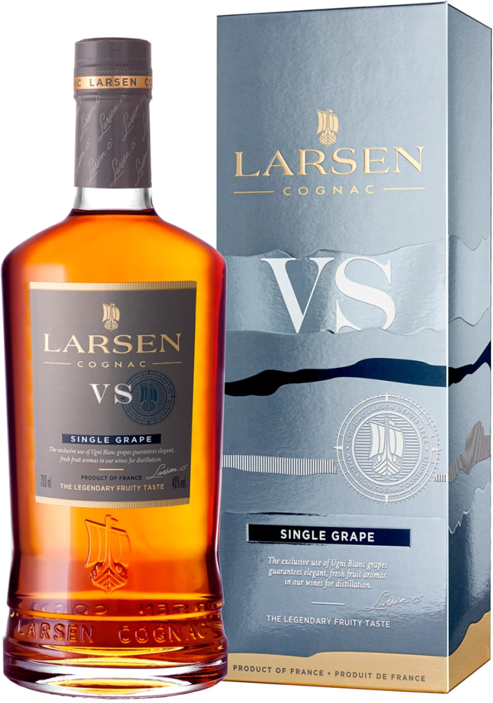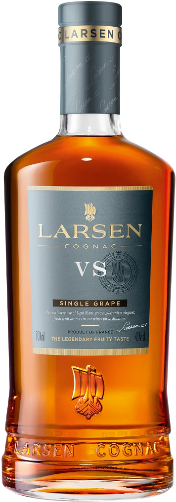 Коньяк "Larsen" VS создается из спиртов, изготовленных из винограда сорта Уни Блан, выращенного в Фэн Буа, и выдержанных более трех лет. Это самый молодой коньяк в линейке "Ларсен". Выдержанный в дубовых бочках, этот коньяк развивает безошибочный характер и демонстрирует насыщенный, гладкий вкус с тонами спелого винограда и душистый аромат с тонами фруктов и деликатными цветочными и травяными нюансами.