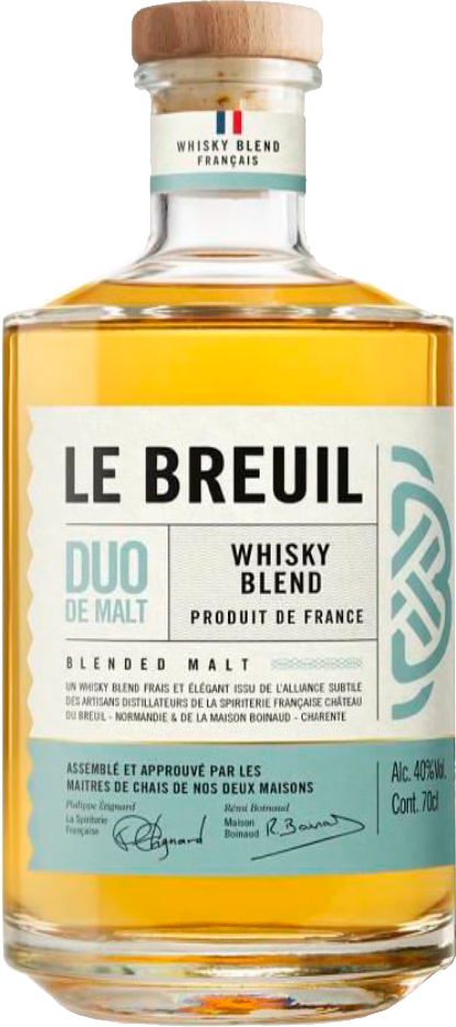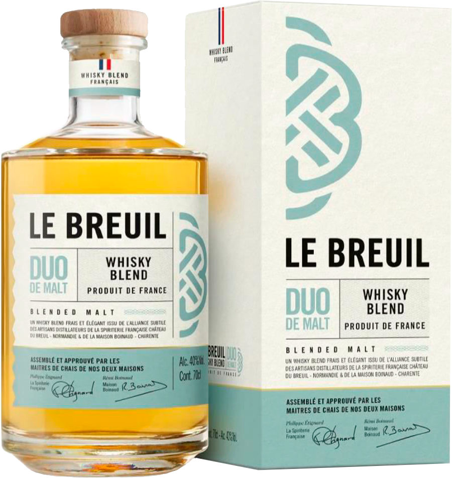 Позже в производственном портфеле появился купажированный солодовый виски "Le Breuil" Duo de Malt (классический и торфяной), который предлагает погружение в гладкость вкуса и сложность аромата. Виски этой серии является результатом длительного процесса отбора, дегустаций и итераций между Филиппом Этиньяром, мастером погреба Château du Breuil/La Spiriterie Française из Нормандии, и Реми Буано из Maison Boinaud из Шаранты. Сотрудничество между двумя семейными предприятиями с одинаковым подходом к производству спиртных напитков, одинаковыми ценностями и единой философией вылилось в тщательную работу по объединению односолодового виски "Le Breuil" и односолодового виски от Maison Boinaud для получения адекватных и взаимодополняющих органолептических характеристик. Поэтому "Le Breuil" Duo de Malt Blend обещает идеально гармоничный баланс между двумя виски, округлость и очень мягкий характер.