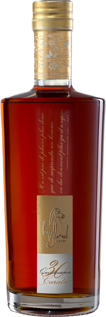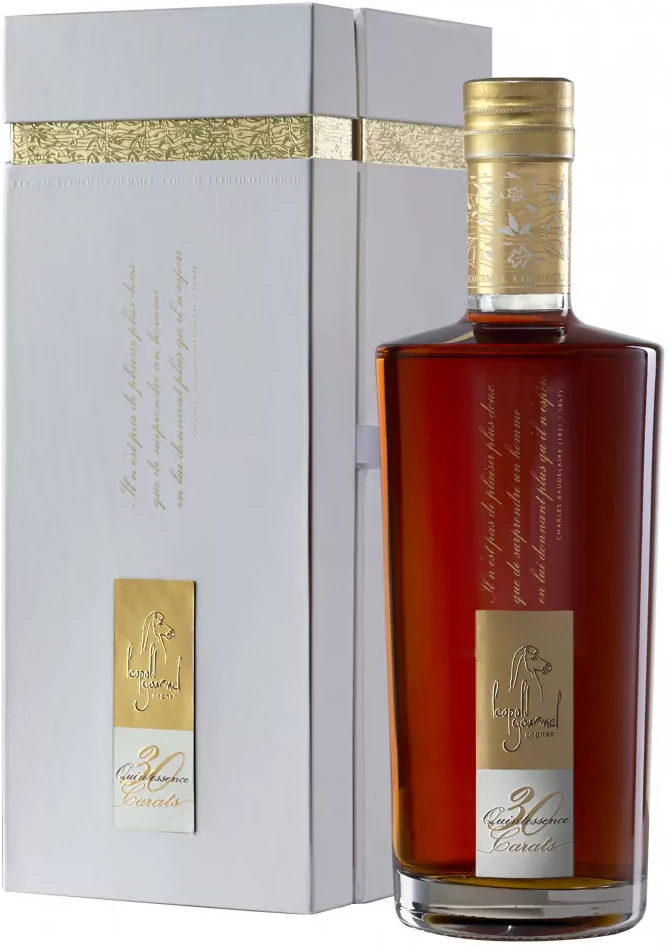 Leopold Gourmel, Quintessence, 30 Carats — богатый, сильный, очень ароматный коньяк, вкус и аромат которого представляют собой гармонию импрессионизма — удивительное, редкое, притягательное сочетание изысканной палитры оттенков. В этом заключается преимущество старого коньяка, выдержанного 30 лет в дубовых бочках. Ведь именно после 25 лет, в последующий десятилетний период, коньяк начинает демонстрировать свою истинную природу и происхождение: проявляются минеральность вина, свежесть первичных ароматов белого винограда, зрелая гармония и бесконечно долгое послевкусие.