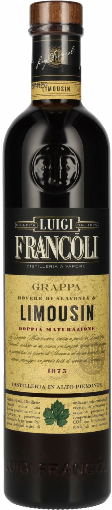 Luigi Francoli, Limousin входит в коллекцию "Le Origini", которая характеризуется глубокой любовью к натуральному происхождению дистиллята. Эта линия представляет собой идеальное выражение традиции, сочетающей в себе заботу, знание терруара и страсть к дистилляции. В производстве этой граппы используются лучшие выжимки преимущественно Неббиоло и Дольчетто из различных винодельческих регионов Пьемонта. Всего 5% Москато привносят интенсивный и уникальный аромат, свежесть в умелый баланс вкуса и обоняния. Дистилляция выжимок, полученных из этого винограда, гарантирует получение мягкой, ароматной и выразительной граппы. Дистилляция выжимок проходит в горизонтальном перегонном кубе непрерывного действия с нагревом водяным паром. Последующая фракционная перегонка осуществляется в медной колонне.