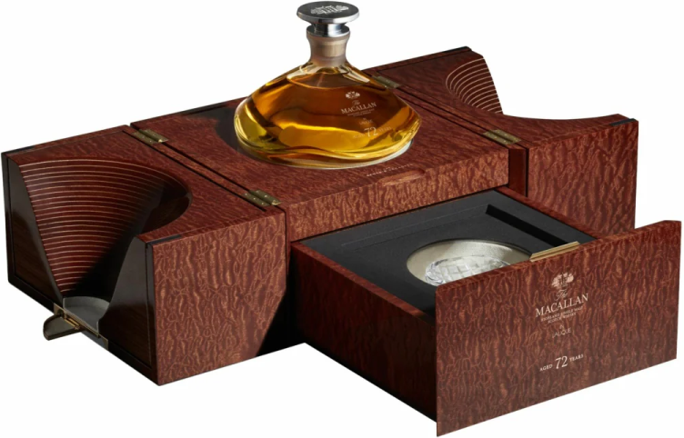 The Macallan in Lalique, 72 Years Old посвящен знаменательному событию в истории бренда - открытию новой дистиллерии и визит центра для посетителей. Это самый старый виски, когда либо выпущенный. Он представлен в хрустальных графинах ограниченной серии домом Lalique. Тираж всего 600 декантеров ручной работы, отождествляющих коллаборацию мастеров из разных областей: мастеров виски, хрустального дела, дизайна, архитектуры и строительства. Мастерство каждого очень отлично от других, но всех объединяет одно, приверженность своему делу и стремление к совершенству. Этот виски знаменует будущее, новую страницу в истории. Новая дистиллерия и визит центр для гостей находится в самом сердце Спейсайда, рядом с духовным домом Ester Elchies, где в течение почти двух столетий, мастера создают исключительный виски. Архитекторы Rogers Stirk Harbour + Partners воплотили в этом проекте страсть и превосходное мастерство, которое заполняет каждую каплю The Macallan. Дистиллированный в 1940-х годах, этот бесподобный спирт начал свой путь созревания в бочках во время оптимистичного периода после Второй мировой войны, когда атмосфера была пронизана надеждами и полна вдохновения. Это настроение помогло дизайнерам, мастерам хрустальных дел и мастерам виски создать уникальный напиток в искусном декантере Genesis. Каждый декантер помещен в деревянный кейс, который изготовили вручную мастера Королевского ордера NEJ Stevenson.