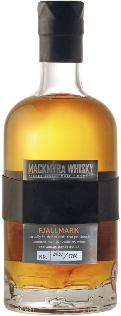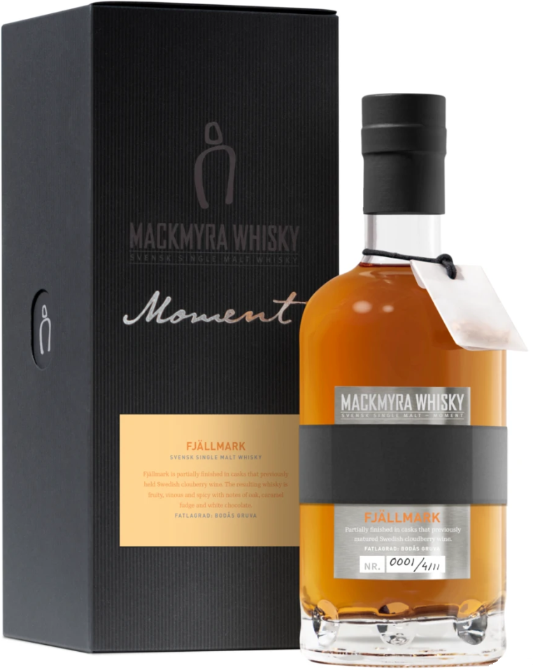 "Mackmyra" Moment Fjällmark — изысканный односолодовый виски, выдержанный в бочках из-под шведского морошкового вина, хереса Oloroso и Pedro Ximenez. Дикорастущая шведская морошка, пожалуй, самая востребованная ягода в Швеции. В этом ограниченном выпуске вино из морошки придало невероятный характер виски! Дымные ноты добавили напитку пикантную остроту в послевкусии. Самые молодые спирты выдерживались в течение 8 лет, а самые старые — 13 лет. "Fjällmark" переводится как "Горная страна", это звучит гордо и потрясающе.