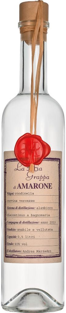 La Mia Grappa, Amarone — граппа родом из провинции Венето. Здесь производят знаменитое вино Амароне, а традиционным для этой местности является так называемый "купаж Вальполичелла", состоящий из винограда Корвина, Рондинелла и Молинара. Выжимки из этих сортов и используются для создания граппы путем паровой дистилляции. Такая технология позволяет сохранить утонченный аромат винограда и придать граппе нежный фруктовый вкус. Каждая бутылка "Ла Миа Граппа" Амароне запечатана с помощью сургуча. Когда-то такое оформление бутылки было обязательным и указывало на то, что продукт проверен, а его качество подтверждено. Позаимствовав такой дизайн, создатели этой граппы, в свою очередь, указывают на ее достойное качество.
