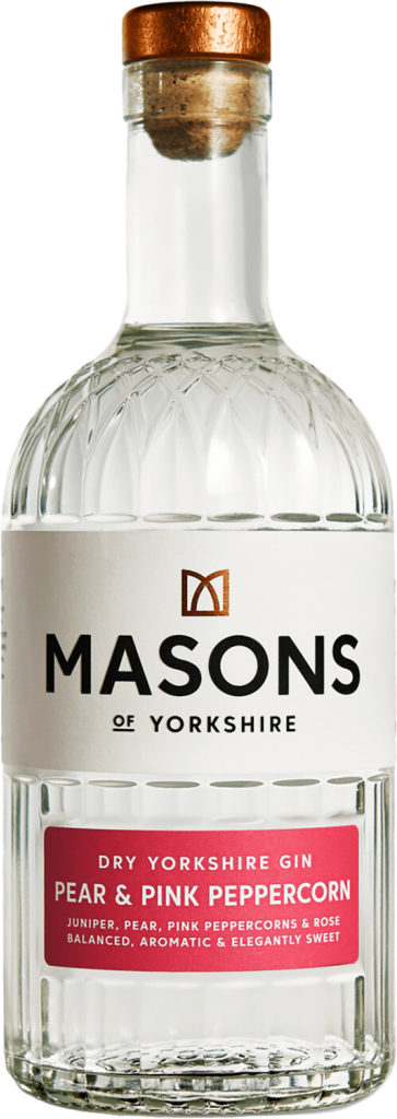 Masons of Yorkshire, Pear & Pink Peppercorn — сухой йоркширский джин с нежным, ароматным вкусом, который прекрасно сочетает в себе сладкую, хрустящую грушу сорта Конференц с нежной согревающей пряностью розового перца горошком. Джин производится небольшими партиями из чистой родниковой воды из Харрогейт, зернового спирта, дистиллята можжевельника и растительных компонентов: груши, розового перца, кориандра, коры кассии, лепестков розы, корня лакрицы и корня ангелии. Каждая бутылка джина имеет написанный от руки номер партии и бутылки.