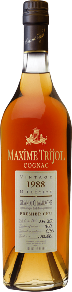 Для создания миллезимного коньяка "Maxime Trijol" Grande Champagne Premier Cru AOC, 1985 производитель использовал высококачественные коньячные спирты из урожая винограда 1985 года. Коньяк подвергли двойной дистилляции в шарантских перегонных кубах. Выдержка дистиллятов длилась не менее 28 лет в бочках из французского дуба. Коньяк был бутилирован 22 января 2018 года, а его релиз насчитывает 480 бутылок.