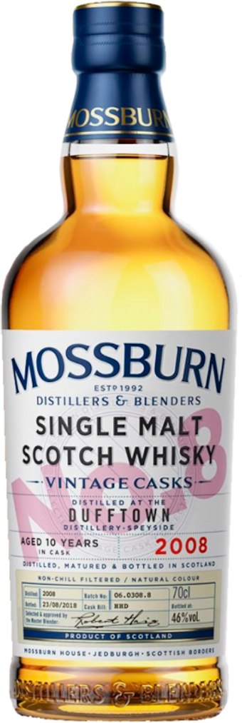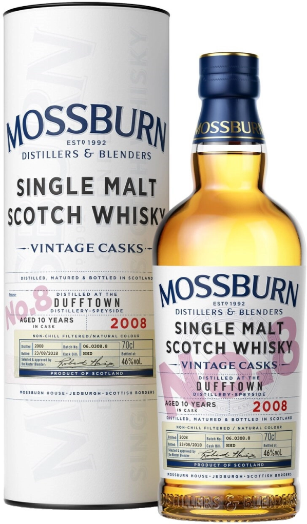 Виски Mossburn, "Vintage Casks" No.8 Dufftown, 2008 был дистиллирован на винокуренном заводе Даффтаун в 2008 году. После этого виски выдерживался 10 лет в дубовой бочке № 06.0308.8. Розлив виски 23 августа 2018 года без холодной фильтрации и дополнительного окрашивания осуществила компания Моссберн.