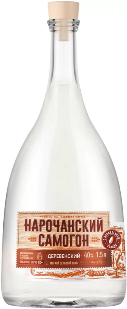Нарочанский Самогон, Деревенский — крепкий спиртной напиток, который производится по оригинальной рецептуре путем купажирования солодового и ржаного дистиллятов. Процесс перегонки сброженного сусла из зерна протекает на медной дистилляционной установке. Уникальность вкуса самогона достигается за счет добавления минеральной воды. Самогон может подаваться в чистом виде как аперитив, а также в сочетании с сытными блюдами русской кухни, соленьями, маринадами, закусками, горячими рыбными и мясными блюдами.