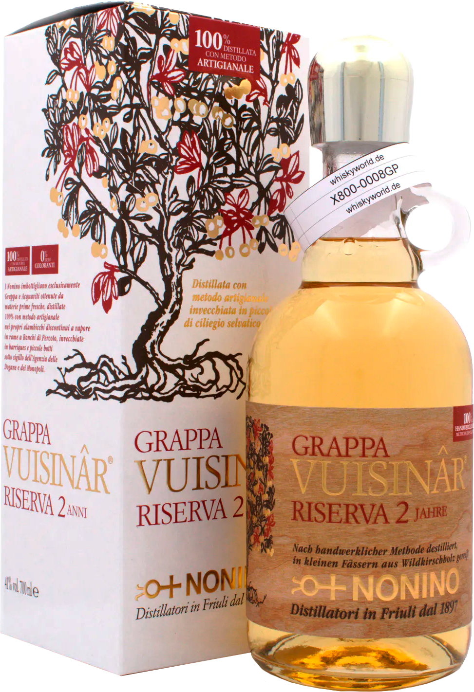 Граппа "Vuisinar" Riserva 2 Anni производится из тщательно отобранных выжимок винограда красных и белых сортов, выращенного в Колли дель Фриули и Фриули Грав. Дистилляция производится вручную в небольшом медном паровом аламбике, для граппы отбирается только "сердце" дистиллята, которое выдерживается до 3-х лет в небольших бочках из сладковатой древесины дикой вишни. При изготовлении граппы не используется краситель. Граппу следует подавать при 12 °C в широком бокале тюльпанообразной формы. Перед дегустацией граппа должна "подышать" в бокале в течение нескольких минут, оксигенация улучшает аромат напитка и совершенствует гармонию между вкусом и ароматом.