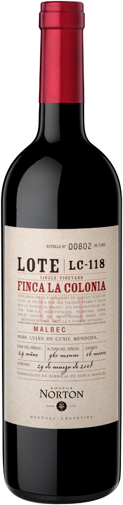 Bodega Norton, Finca La Colonia, Lote LC-118 — роскошное, пьянящее, выразительное красное вино созданное из винограда сорта Мальбек, имеющее плотность и глубину, зрелость и открытость. Урожай для создания вина собирается по достижении ягодами оптимального уровня спелости. На винодельне плоды подвергаются холодной мацерации в течение 5 дней при температуре 10°С. Затем винное сусло ферментируется в течение 16 дней с постферментационной мацерацией в течение 10 дней. Выдерживается вино в бочках из французского дуба на протяжении 16 месяцев.