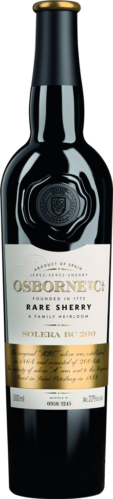 Херес Osborne, Oloroso Solera "BC 200" Rare Sherry создается из традиционных для Испании сортов винограда, которые и придают напитку особенный, тонкий вкус. Этот херес относится к числу редких и выпускается в ограниченном количестве. При его изготовлении применяется метод "солера" (так называется нижний ряд бочек, над которым еще возвышаются 4-5 рядов — криадера). Перед розливом по бутылкам, из солеры отбирается 1/3 содержимого, а остальная часть дополняется из вышестоящих емкостей. Херес "BC 200" прошел сорокалетнюю выдержку. За столь длительное время пребывания в дубовых бочках при определенных условиях, вино приобретает свой стиль, индивидуальность и благородные качества, свойственные этому шедевру с юга Андалусии.