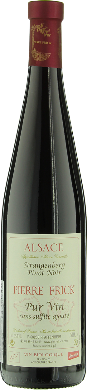 Pierre Frick, "Strangenberg" Pinot Noir — престижное красное сухое вино, обладающее высоким классом, стилем и большой индивидуальностью. Виноград для его изготовления выращивается на биодинамических виноградниках. Урожай проходит спонтанную алкогольную ферментацию с использованием натуральных дрожжей и мацерацию на кожице в течение 10 дней. Затем вино несколько месяцев выдерживается в дубовых бочках старше 80 лет и разливается по бутылкам без добавления серы (или с минимальным количеством).