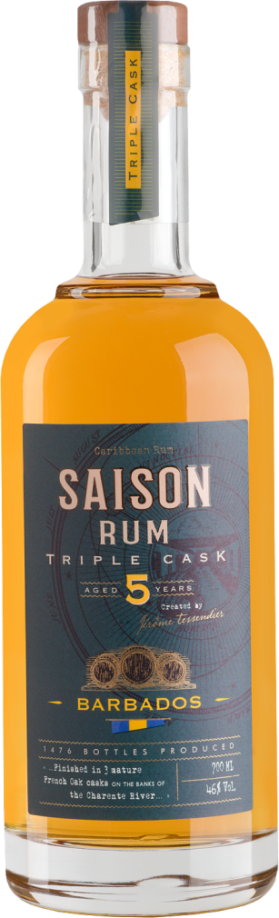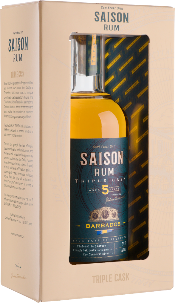 Для рома Saison, Triple Cask, Barbados, 5 Year Old - Жером Тессендье отбирает лучшие дистилляты на основе сахарного тростника из Барбадоса. Изначально спирты выдерживаются минимум три года в бочках из-под бурбона на Барбадосе. Затем различные партии выдержанного рома приезжают во Францию, в провинцию Коньяк, где купажируются и дополнительно выдерживаются 24 месяца сначала в бочках из французского дуба «средней зернистости» для извлечения слегка обжаренных и пряных ароматов, а после в бочках из «мелкозернистого» дуба, чтобы создать изысканное и гармоничное послевкусие. По окончании выдержки добавляется дистиллированная вода для снижения спиртуозности до 46%. Колоранты не применяются.
