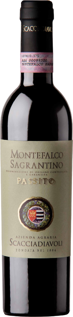 Scacciadiavoli, Montefalco Sagrantino, Passito — традиционное умбрийское сладкое красное вино, произведенное на винодельне Scacciadiavoli из винограда редкого сорта Сагрантино. Виноградные лозы растут на глинисто-сланцевых почвах участков с юго-западной экспозицией, на высоте 400 метров над уровнем моря. Урожай собирается ручным способом в конце сентября, затем виноград транспортируется на винодельню в маленьких стальных ящиках. После ферментации сусло выдерживается 16 месяцев в новых барриках, а после розлива дополнительно созревает еще 9 месяцев в бутылках.
