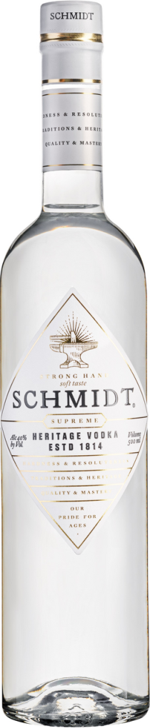 Schmidt, Supreme — премиальная водка, которая отличается своим чистым составом без примесей и искусственных добавок. Для производства водки используют исключительно высококачественный зерновой спирт, который получают из отборной пшеницы, ржи и тритикале, и чистейшую воду, добытую на глубине 220 метров из собственной скважины компании. Исключительная особенность водки "Шмидт" Суприм, которая и делает ее такой уникальной — жемчужная фильтрация. Технология жемчужной фильтрации не имеет аналогов во всем мире, благодаря ей водка приобретает несравненно мягкий и питкий вкус. Жемчуг — это воплощение девственной чистоты природы, ее простоты и естественности. Все эти качества воплощены в водке "Schmidt" Supreme.