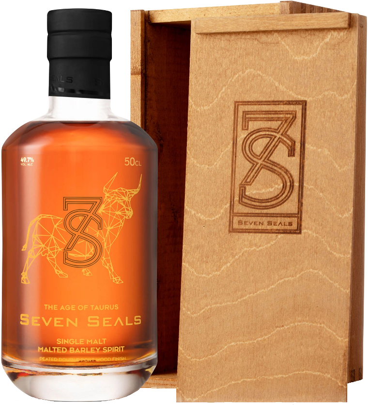 Seven Seals, Zodiac, The Age of Taurus, Single Malt — односолодовый виски крепостью 49,7%, который производится по уникальной технологии Штокхаузена. Изобретатель, доктор Дольф Штокхаузен, именем которого назван метод, полностью изменил процесс старения виски и сократил его на годы. Его идея основана на физическом законе, имитирующем выдержку в бочке. В 2017 году, после многих лет исследований, Дольф Штокхаузен разработал устойчивый процесс и добился мировой сенсации своим изобретением. Данный метод предусматривает распил бочки на щепки с последующим добавлением этих щепок в дистиллят. Такой способ позволяет древесине контактировать с дистиллятом и насыщать виски в 6 раз быстрее по сравнению с традиционной выдержкой в бочках. Для выдержки виски "Seven Seals" Zodiac The Age of Taurus Single Malt использовались бочки из-под портвейна.