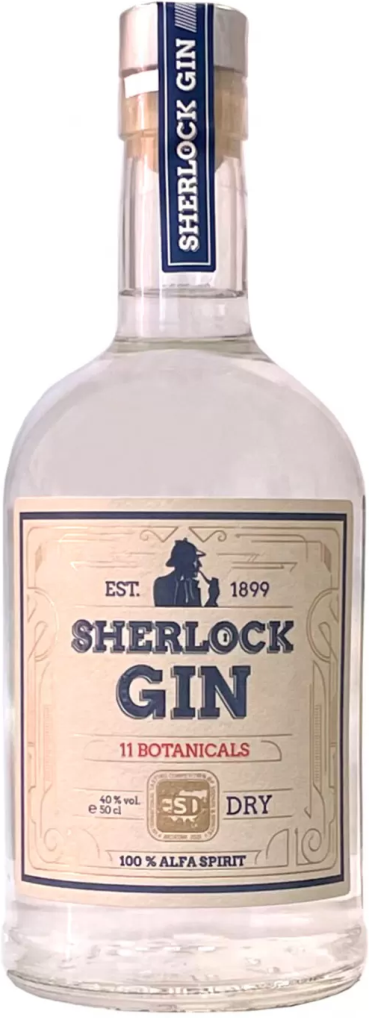 Sherlock, Dry Gin — сухой джин, изготовленный из отборных ингредиентов. В его производстве используется зерновой спирт класса "Альфа", специально очищенная вода и 11 растительных компонентов (ягоды можжевельника, сушеная лимонная цедра, флоретинский ирис, лист черной смородины, дягиль, солодка, розмарин, кардамон, другие специи и пряности). Элегантная бутылка привлекает внимание своим оригинальным дизайном, этикетка украшена изображением силуэта выдающегося сыщика Шерлока Холмса, курящего трубку.