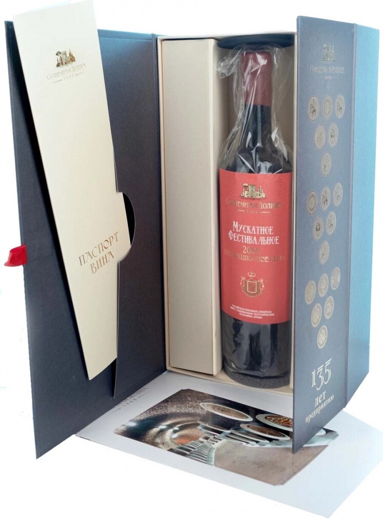Мускатное Фестивальное, 2001 — коллекционное розовое ликерное вино, созданное из пяти мускатных сортов винограда — Мускат Белый, Мускат Розовый, Мускат Оттонель, Мускат Гамбургский и Мускат Александрийский. Такое разнообразие сортов в гармоничном тандеме дарит вину богатый аромат и глубокий вкус. Бутылочная выдержка усиливает эти характеристики, предлагая вино, достойное любой коллекции. Напиток назван в честь винного фестиваля, который проводится в Солнечной Долине с 2001 года.