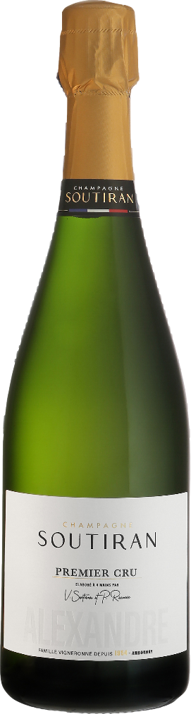Soutiran, Alexandre, Premier Cru, Brut — мягкое, округлое шампанское для гурманов, изготовленное из винограда сортов Шардоне, Пино Нуар и Пино Менье, которые выращиваются на виноградниках класса Премье Крю в апелласьоне Шампань. Местные меловые почвы придают винам выразительную минеральность, которая выражается в соленых и йодированных нотах. Урожай собирают вручную в течение примерно 10 дней. После прессования с использованием мембранного пресса полученное сусло ферментируется в стальных чанах при контролируемой температуре. По завершении яблочно-молочного брожения базовое вино проходит холодную стабилизацию и фильтрацию через глиняные фильтры. После бутилирования кюве выдерживают на осадке в подвалах винодельни в течение 3-х лет. После дегоржажа (извлечение осадка из бутылки) добавляется дозировочный ликер, количество которого устанавливается после ряда испытаний в лаборатории и слепых дегустаций. Гармония и баланс — основные элементы, к которым стремится дегустационная комиссия. Затем кюве выдерживают в среднем еще 6 месяцев до реализации, этот период обеспечивает однородность шампанского. Потенциал хранения "Александр" Премье Крю Брют составляет не менее 10 лет.