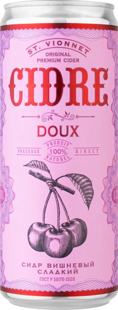 St. Vionnet, Cherry Doux - сладкий вишневый сидр, который производится на Юге России по традиционной технологии лучших французских сидров из солнечных свежих яблок, выращенных на Кубани и собранных вручную, с добавлением вишневого сока. Вишневый сидр можно считать универсальным слабоалкогольным напитком, приятным и томным, который является как аперитивом, так и дижестивом. Благодаря низкому содержанию алкоголя - всего 5,5%, St. Vionnet, Cherry Doux обладает умеренной сладостью и ярким вкусом вишни. Это делает вишневый сладкий сидр отличным выбором для тех, кто предпочитает легкие и освежающие напитки. Эксклюзивный 3D дизайн, низкая калорийность, незабываемый вкус!