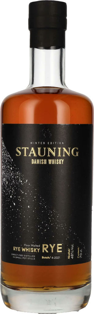 Stauning, Rye, Winter Edition — зимняя версия классического Stauning, Rye, созданная, чтобы согревать холодными зимними вечерами, дарить тепло и уют. Долгие, холодные и темные скандинавские зимы отличаются невероятной красотой, философским покоем и глубиной. Все это отражено в "Винтер Эдишн". Ячмень и рожь для этого виски выращиваются в нескольких километрах от винокуренного завода. 10 тонн ячменя и ржи разбрасывают вдоль длинной дороги, ограниченной двумя низкими бетонными стенами, между которыми установлена машина для переворачивания солода, спроектированная командой Стаунинг и изготовленная местным кузнецом. Она состоит из ряда вертикальных вращающихся рычагов и распылительного механизма. Когда машина заводится, она медленно движется по полосе. Вода разбрызгивается, а рычаги начинают осторожно вращаться, чтобы обеспечить равномерное впитывание. Это называется замачиванием. Торф используется в качестве источника тепла для сушки и ароматизации солодового ячменя и ржи. Время от времени используют даже местный вереск. Затирание проходит в большом резервуаре, похожем на стиральную машину — это авторский подход винокурни. Брожение занимает 4 дня, что по шотландским меркам довольно долго. Длительная ферментация придает больше вкуса. 24 перегонных куба прямого нагрева отвечают за двойную дистилляцию. Стаунинг, Рай "Винтер Эдишн" выдерживается в течение не менее 3-х лет в бочках из американского дуба. Виски разливается вручную без холодной фильтрации на линии, на которой работают местные жители, друзья и родственники основателей Стаунинг.