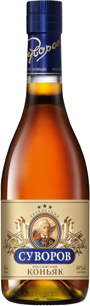 Коньяк "Суворов" 3-летний производится из виноградных спиртов, полученных из белых сортов винограда, выращенных в России. Коньяк получил свое название в честь прославленного русского полководца — Александра Васильевича Суворова. Спирты, входящие в купаж, выдерживались в дубовых бочках не менее 3-х лет. Напиток обладает приятным золотистым цветом, тонким ароматом с нотами смолы и цветов и мягким, гармоничным вкусом. Коньяк "Суворов" рекомендуется употреблять в качестве дижестива, в сочетании с кофе или в составе коктейлей.