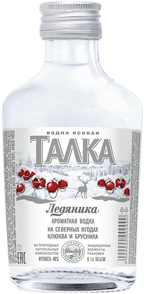 "Талка" Ледяника — новинка в ассортименте "Талка". Водка создана на основе натурального настоя северных ягод. Уникальная этикетка с переливающимися ледяными ягодами и искрящимся на них снегом подчеркивает яркость и неповторимость вкуса водки, сочетающего в себе чистоту нетронутой сибирской природы, морозную свежесть и ароматные тона клюквы и брусники.