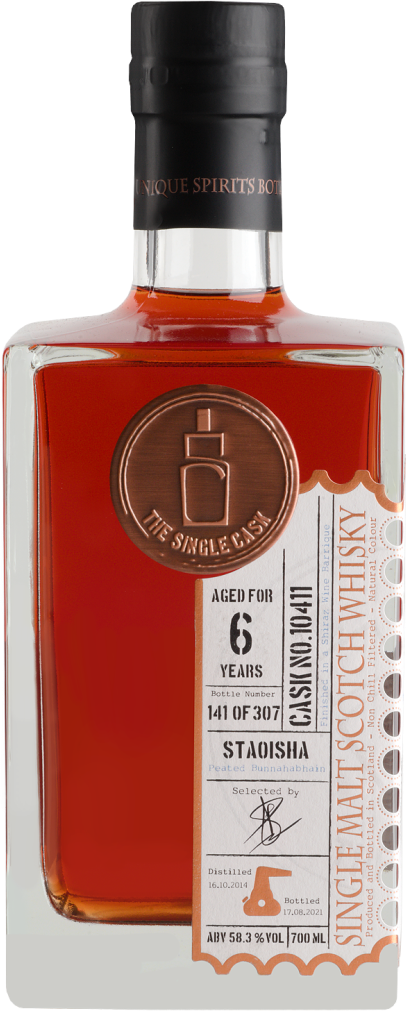 The Single Cask, "Staoisha" Cask № 10411 6 Years Old — удивительный виски, который, благодаря тонкому сочетанию свежести и совершенной зрелости, способен вызывать глубокие эмоции. Спирты дистиллированы на винокурне Bunnahabhain в 2014 году. Бочка из-под Шираза под номером 10411 была выкуплена компанией Сингл Каск, после 6-летней выдержки был сделан розлив в формате Single Cask при бочковой крепости 58,3 градуса. Всего разлито 307 бутылок.
