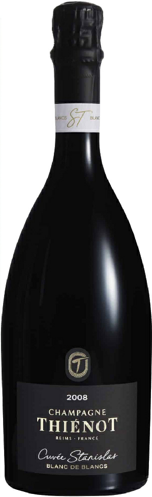 Thienot, "Cuvee Stanislas" Blanc de Blancs, Champagne, 2008 — роскошное кюве знаменитого Дома Champagne Thienot, принадлежащее известному магнату Алену Тьено. В его производстве используется виноград сорта Шардоне (90% Гран Крю). Сбор урожая проводится исключительно вручную в момент оптимальной спелости ягод, на винодельне плоды подвергаются прессованию с последующей ферментацией, проходящей в стальных резервуарах со строгим температурным контроем. Вторичная ферментация и дальнейшая выдержка в течение 12 лет проводится в бутылке.