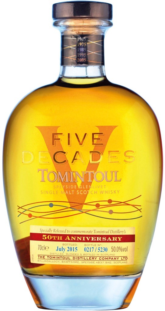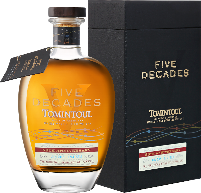 Tomintoul, "Five Decades" — чистый, мягкий, сладковатый односолодовый виски, приуроченный к пятидесятой годовщине винокурни Томинтоул. Этот потрясающий релиз был составлен в 2015 году из виски каждого десятилетия. Мастер-дистиллятор Роберт Флеминг отобрал для "Five Decades" виски 1965, 1975, 1985, 1995 и 2005 годов. Минимальный срок выдержки спиртов составил 10 лет. Объем выпуска составил 5230 бутылок, каждая из которых имеет индивидуальный номер.