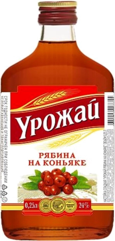 Сладкая настойка "Урожай" Рябина на коньяке объединяет в себе благородные тона коньяка и терпковатый кисло-сладкий вкус ягод рябины. Настойка изготавливается из спирта класса "Люкс", чистой питьевой воды, сахарного сиропа, спиртованного морса рябины и коньяка. При создании настойки используются исключительно натуральные ингредиенты, что позволяет получить продукт надлежащего качества. Настойка может подаваться как аперитив, дижестив или в сочетании с десертами.