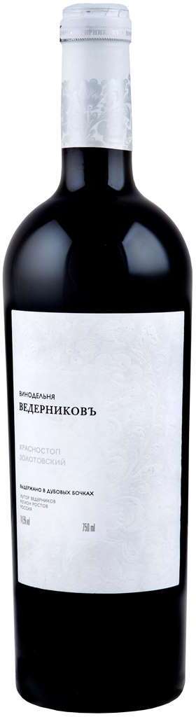Выдержанное вино "Красностоп Золотовский" от винодельни Ведерниковъ изготовлено из винограда сорта Красностоп Золотовский. Вино производят на модернизированных линиях, где используется гребнеотделитель, французская дробилка и крио-мацератор. Урожай собирают в ящики вместимостью 12-14 кг, после чего сортируют вручную. Виноград произрастает на участках со сниженной урожайностью — до 4 000 кг/га, что позволяет повысить концентрацию полезных веществ и обеспечивает оптимальное вызревание ягод. После сбора урожая, сортировки и ферментации вино "Красностоп Золотовский" выдерживают в бочках из французского дуба в течение 16 месяцев. Перед подачей вино рекомендуется декантировать.