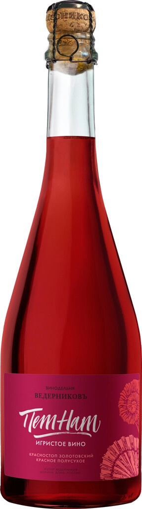 Ведерниковъ, Пет-Нат, Красностоп Золотовский — полусухое игристое вино, изготовленное из уникального автохтонного винограда сорта Красностоп Золотовский, который является достоянием "Винодельни Ведерниковъ". Этому сорту присущ довольно насыщенный аромат и многогранный, сбалансированный вкус с умеренными танинами. Пет-Нат (pét-nat или pétillant naturel) — натуральное игристое вино, первые упоминания о котором относятся к XVI веку. Суть метода Пет-Нат/Ансестраль заключается в том, что вино разливается в бутылки не добродившим, после одной ферментации в чанах, которая останавливается путем охлаждения. Винные дрожжи и остаточный сахар запускают вторичное брожение уже в закупоренной бутылке. Поэтому после ее открытия получается игристое вино, а не тихое. Пет-Нат производится без оклейки и фильтрации. Метод Ансестраль подразумевает большое количество ручного труда, и Пет-Нат от "Винодельни Ведерниковъ" соответствует этому принципу.