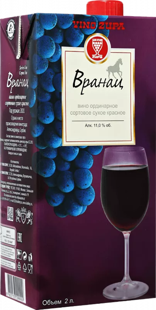 Vino Zupa, Vranac — очень приятное сербское вино с легкой терпкостью и характерными нотами очень спелых темных фруктов и сухофруктов во вкусе и аромате. Вранац — одно из самых распространенных вин компании Вино Зупа на рынке. Демократичная цена, высокое качество напитка и упаковка Тетра Пак делают его очень популярным. Вино подходит для повседневного употребления, пикников, загородного отдыха.