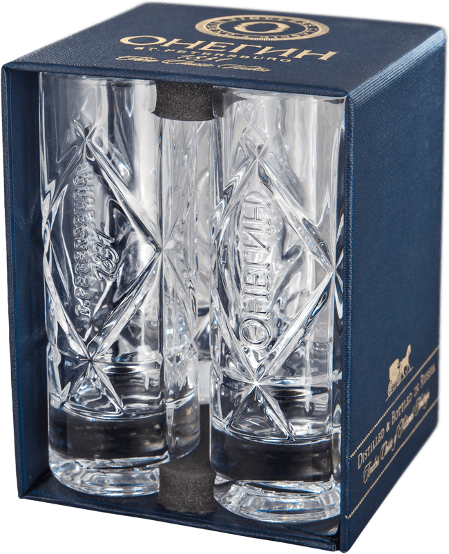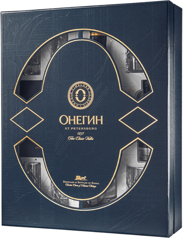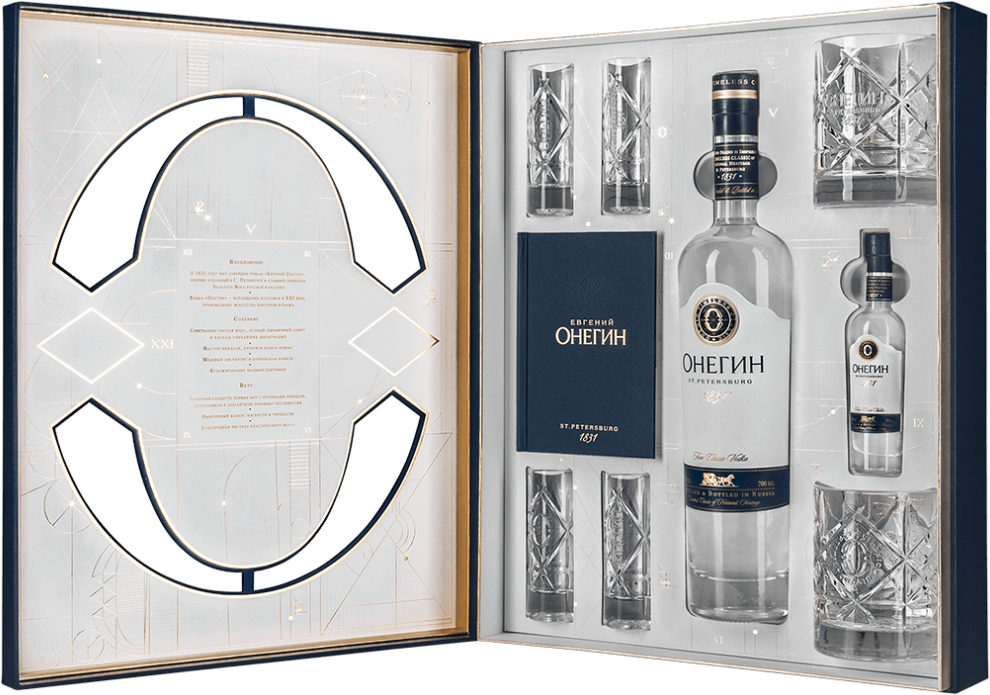 Подарочный набор включает две бутылки водки "Онегин" объемом 700 мл и 50 мл, два фимемнных стакана Rocks и 4 рюмки Rocks, всемирно известный роман А. С. Пушкина, "Евгений Онегин". Такой презент по достоинству оценит настоящий ценитель классики и литературы.