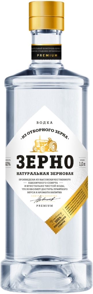 Зерно, Натуральная Зерновая — натуральная водка класса Премиум из отборного зерна. В состав водки входят высококачественный пшеничный спирт, настой спиртованный пшеничных сухарей, настой спиртованный пшеницы и кристально чистая вода. Пятиступенчатая очистка водки, контроль на всех этапах производственного процесса и высококачественные ингредиенты обеспечивают продукту приятный, мягкий вкус и аромат, а также бескомпромиссное качество.