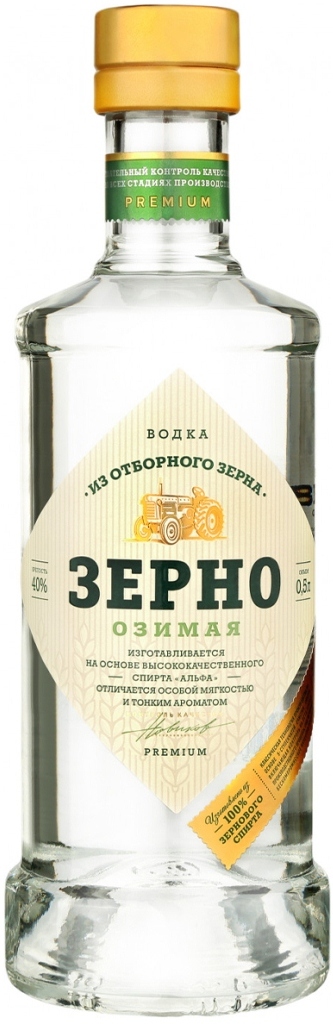Зерно, Озимая — натуральная водка класса Премиум из отборного пшеничного зерна. В состав водки входят высококачественный спирт класса "Альфа", настой спиртованный зерна озимой пшеницы, кристально чистая питьевая вода и сахарный сироп. Пятиступенчатая очистка водки, контроль на всех этапах производственного процесса и высококачественные ингредиенты обеспечивают продукту приятный, мягкий вкус и аромат, а также бескомпромиссное качество.